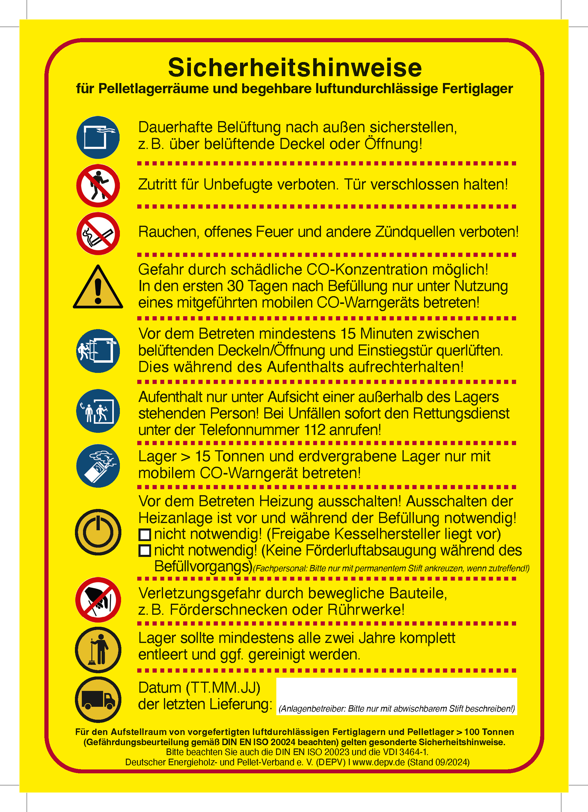 Auf jeden Fall sollten an der Tür zum Lager von innen und außen Aufkleber mit Sicherheitshinweisen gut sichtbar angebracht werden. Solche Aufkleber in den Varianten „Lagermenge weniger als 10 t“ und „Lagermenge größer 10 t und erdvergrabene Lager“ können kostenlos beim Deutschen Pelletinstitut unter www.depi.de/shop bezogen werden. Sie entsprechen der neuen VDI-Richtlinie 3464.