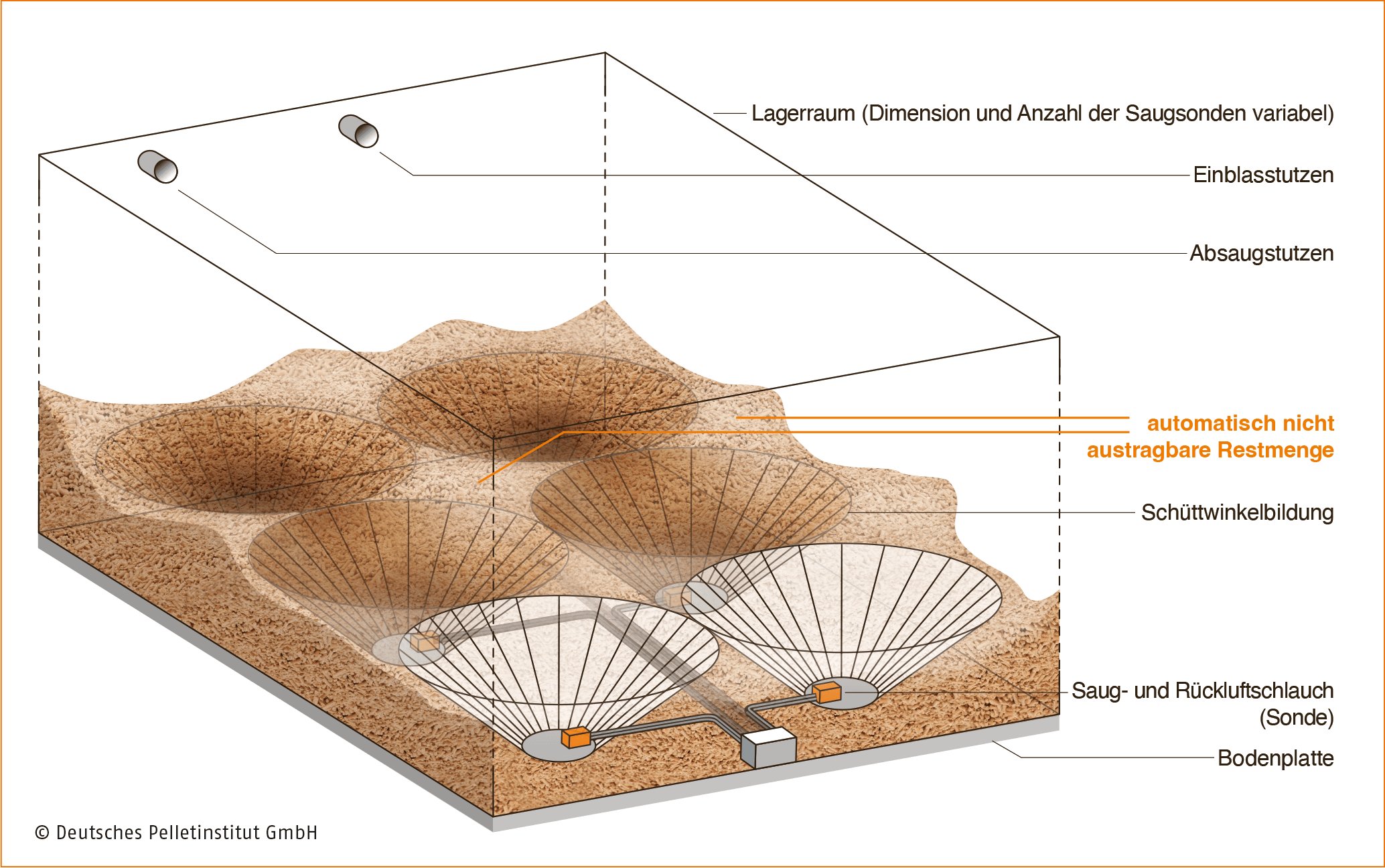 Abhängig von der Anzahl der Lieferungen ohne händische Entleerung werden Feinanteile im unteren Bereich gemäß der Förderversuche an Pelletschüttungen angesetzt.